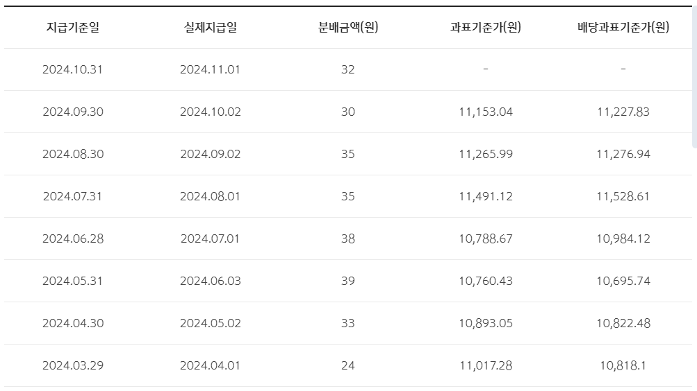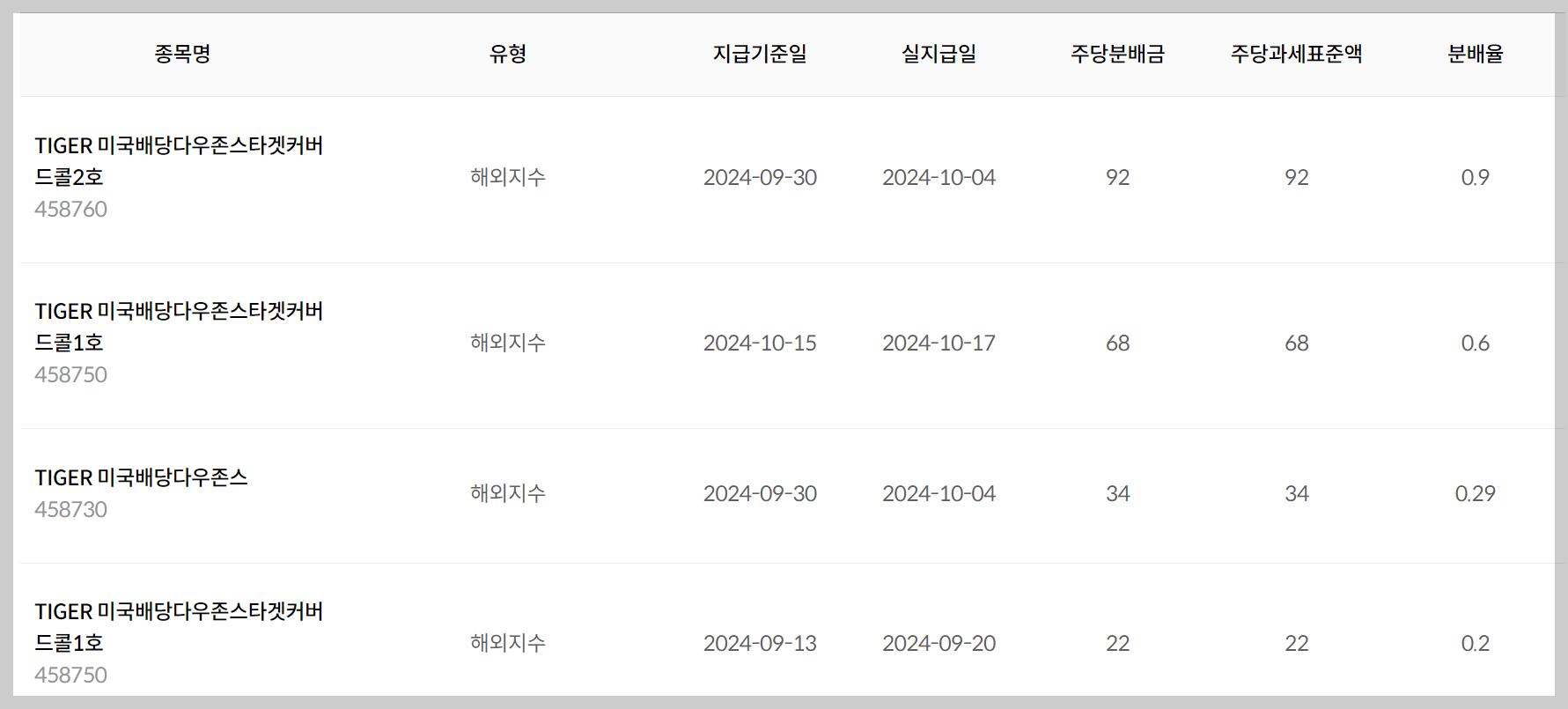 위의 사진은 TIGER 미국배당다우존스의 배당일 및 지급일입니다. 혹시 투자하실 분들은 꼭 참고하세요.