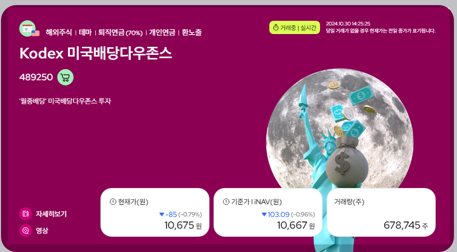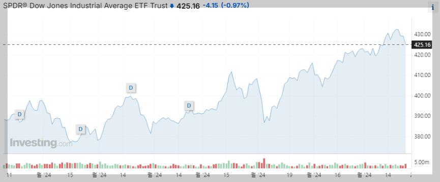 이것도 마찬가지로 다우존스 지수를 추종하기 때문에 미국주식의 전반적인 경제흐름을 나타내는 지표로 보시면 되는데요.