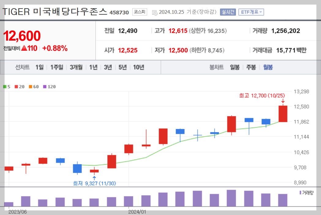 TIGER 미국배당 다우존스 ETF의 장점으로는 월 배당이라는 점, 미국 지수를 추종하기에 전반적인 우상향이라는 점입니다. 물론 미국 경제 지수가 변동이 크기에 변동이 클 수도 있습니다.