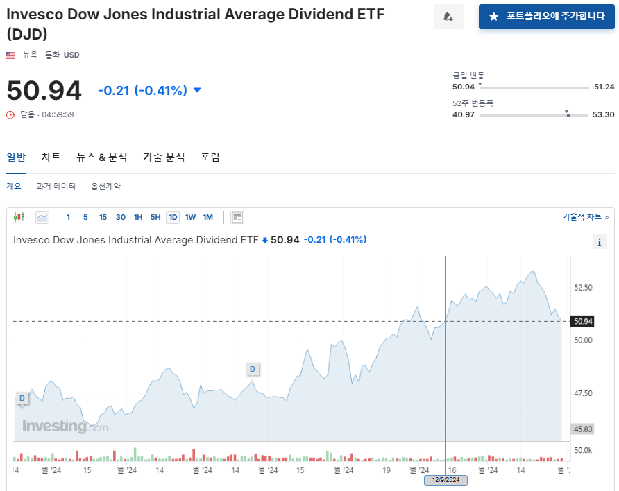 다른 점이라고 한다면 DJD는 DIA와 다르게 다우존스 지수 중에서 배당금이 높은 종목에 좀 더 집중적으로 투자하는 ETF라는 점입니다.