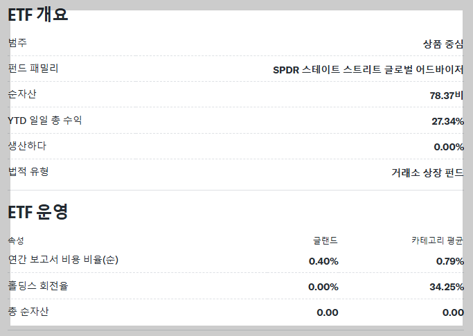 금 가격을 추종하는 ETF로, 포트폴리오의 헤지 수단으로 많이 활용됩니다. 금 가격을 추종하는 ETF 중에서 가장 인기 많은 ETF입니다. 시장의 불확실성이 높아질 때 투자자들에게 많은 고평가를 받는 ETF입니다.