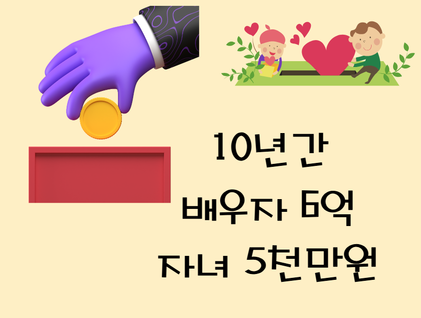 10년간 배우자에게 6억 원까지는 증여세가 없고 자녀에게는 5천만 원(미성년자 2천만 원)까지는 증여세 없이 증여가 가능합니다.