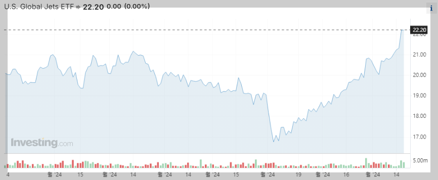 JETS는 미국의 대표적인 항공주 ETF로 코로나가 끝난 직후에 상당히 상승을 보여주었습니다.