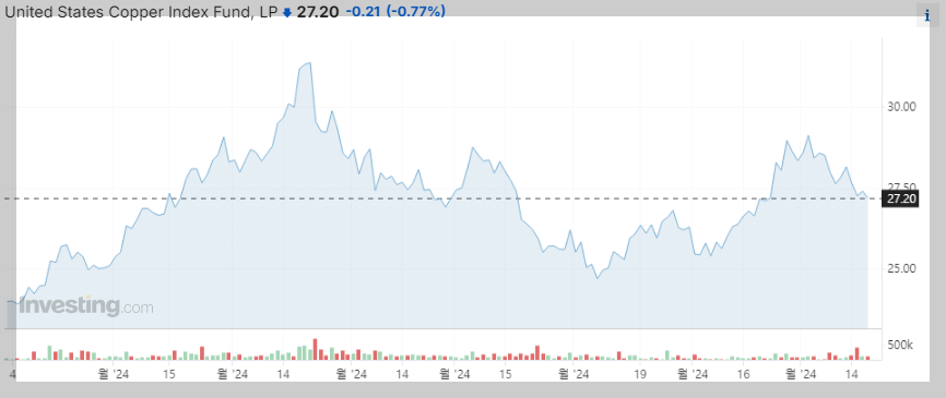 결론적으로 CPER은 구리 선물 시세를 추종하는 ETF입니다. 구리의 요즘 핫한 반도체와 2차 전지의 재료로 쓰이기에 반도체 호황 및 2차 전지 호황의 경우 상승의 흐름을 보입니다.