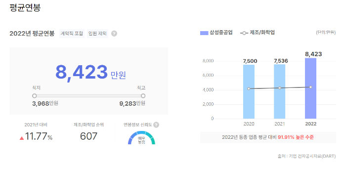 이거는 단순 호기심에 찾아봤는데요. 2022년도 삼성중공업 직원 평균연봉입니다. 약 8500만 원 정도입니다. 그냥 소소한 재미로 보시면 될 것 같네요.