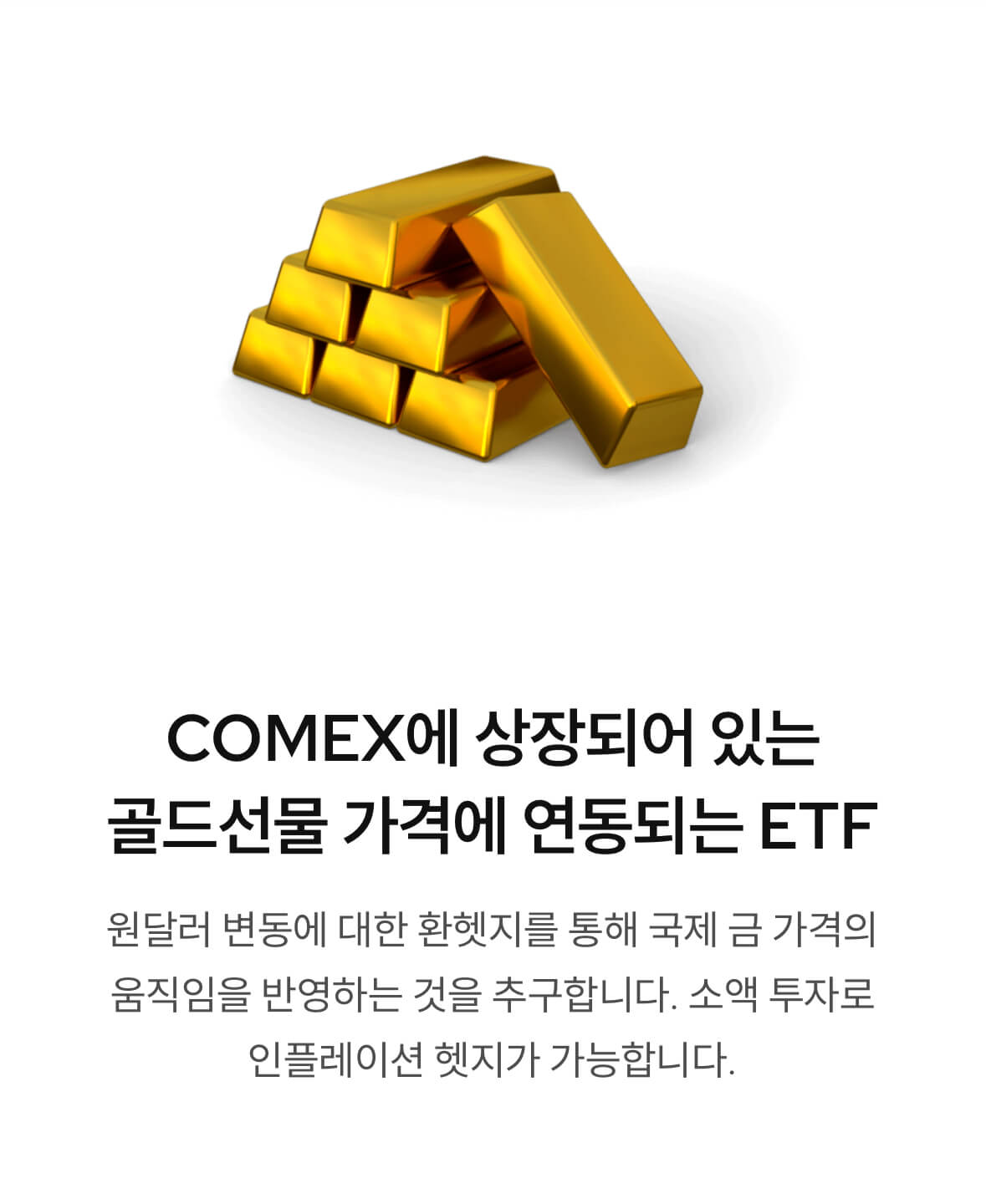 금 선물 가격을 추종하는 ETF로, 안전자산에 투자하고자 하는 투자자에게 적합합니다.