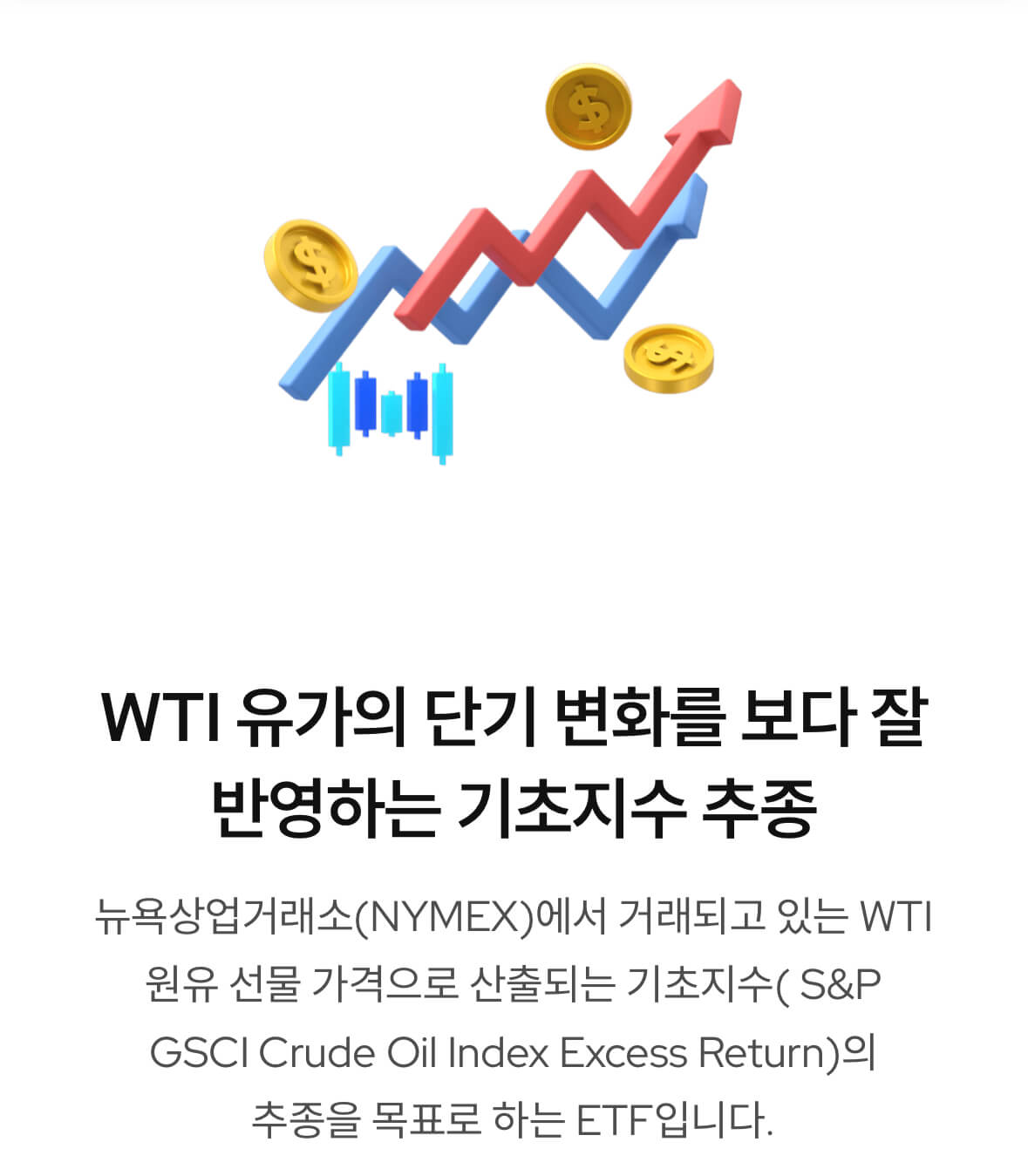 WTI(서부텍사스산 원유) 가격을 추종하며, 원유 시장의 가격 변동성을 활용한 투자 상품입니다.