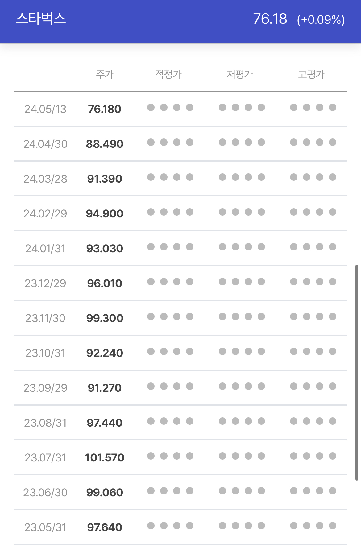 스타벅스 현재 주가는 76달러 정도입니다. 1년 최고 107달러 정도로 상당히 내려와 있습니다.