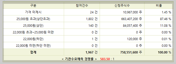 신성에스티의 기관수요예측 결과는 583.5:1로 나쁘지 않은 결과가 나왔습니다.