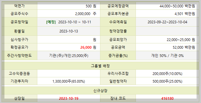 공모청약일은 2023년 10월 10일 ~ 2023년 10월 11일이고 상장일은 2023년 10월 19일에 코스닥에 상장이 됩니다.