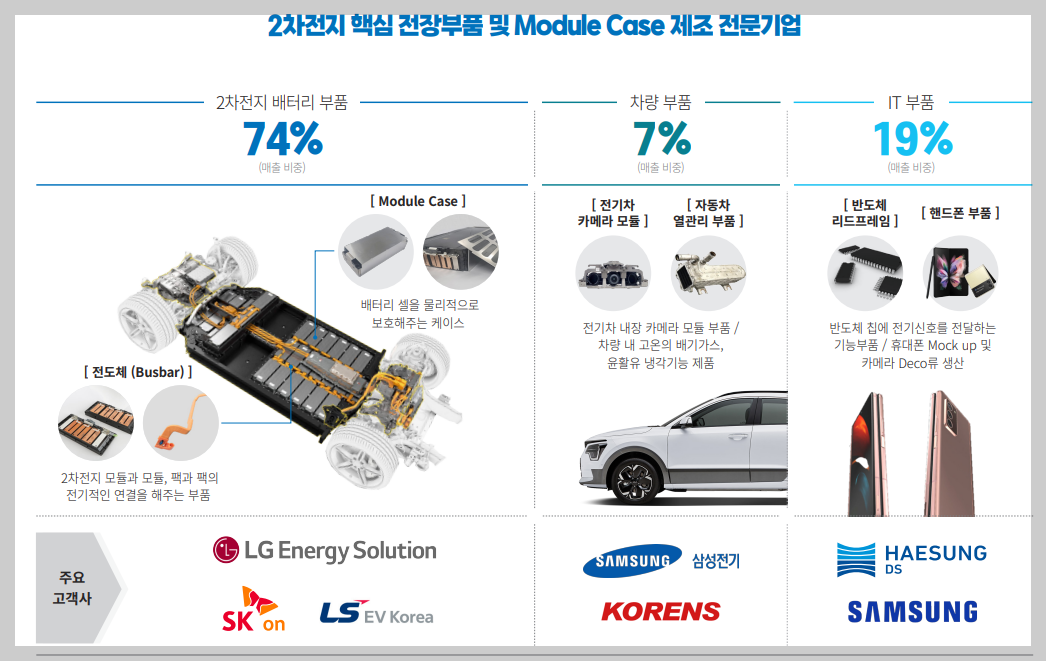 즉 2 차전지용 핵심부품을 제조하는 기업 모듈케이스, 전도체 부스바(이음선으로 생각하시면 됩니다.) 등이 주력 제품입니다.