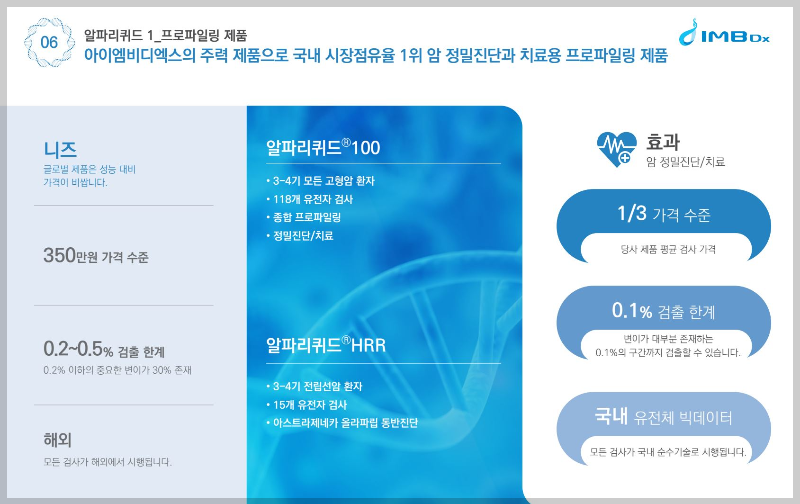 아이엠비디엑스는 간단하게 암 정밀, 조기진단 기업으로 차세대 염기서열 기반 액체생검 전문 기업입니다.