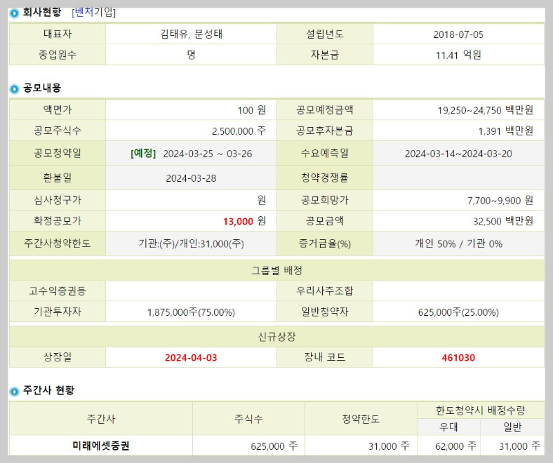 위에서도 말했지만 희망공모가 밴드 7,700원~9,900원보다 많이 높은 13,000원입니다.