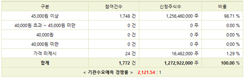 알멕은 국내외 1,772개 기관이 참여해 2,121.54대 1의 경쟁률을 기록했습니다. 엄청난 경쟁률입니다. 저는 이것만 봐도 청약을 진행할 것 같습니다.