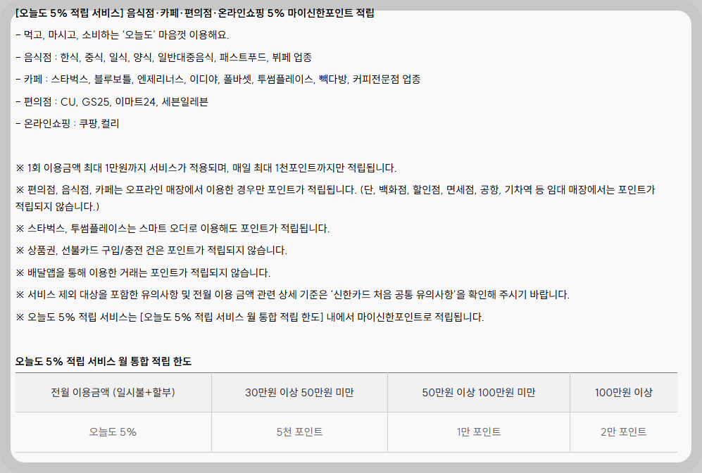 오늘도 5% 적립 혜택입니다. 5% 적립은 마이신한포인트로 적립이 됩니다.