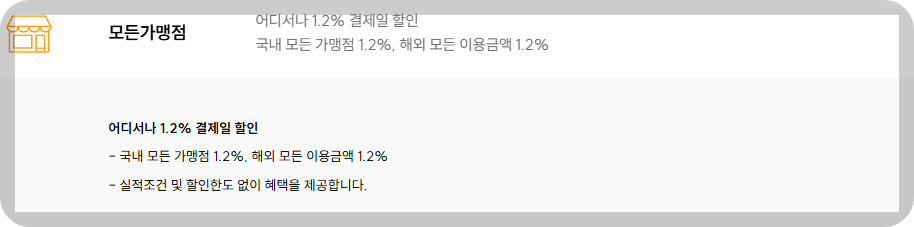 주요 혜택은 모든 가맹점에서 1.2% 결제일 할인이 됩니다. 할인한도는 없습니다.