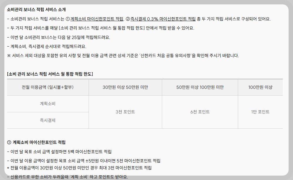 계획소비 적립의 경우에는 두 가지 형태가 있는데요. 계획소비 마이신한포인트 적립과 즉시결제 0.3% 마이신한포인트 적립이 있습니다.