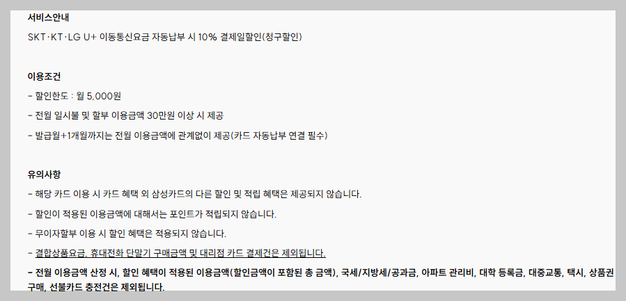 간단하게 설명하면 통신요금 3사(SKT, KT, LGU) 자동납부 시 10% 할인이고 한도는 5,000원입니다.
