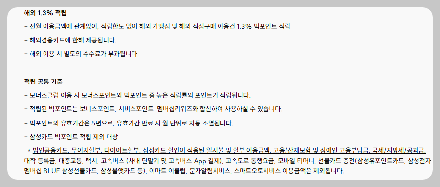해외 1.3% 적립입니다. 요즘 해외여행 많이들 가시죠? 이건 상당히 꿀 혜택입니다. 삼성 taptapO는 혜택 자체가 꽤나 괜찮은 편인데 이런 추가적인 혜택이 있어서 좋습니다.