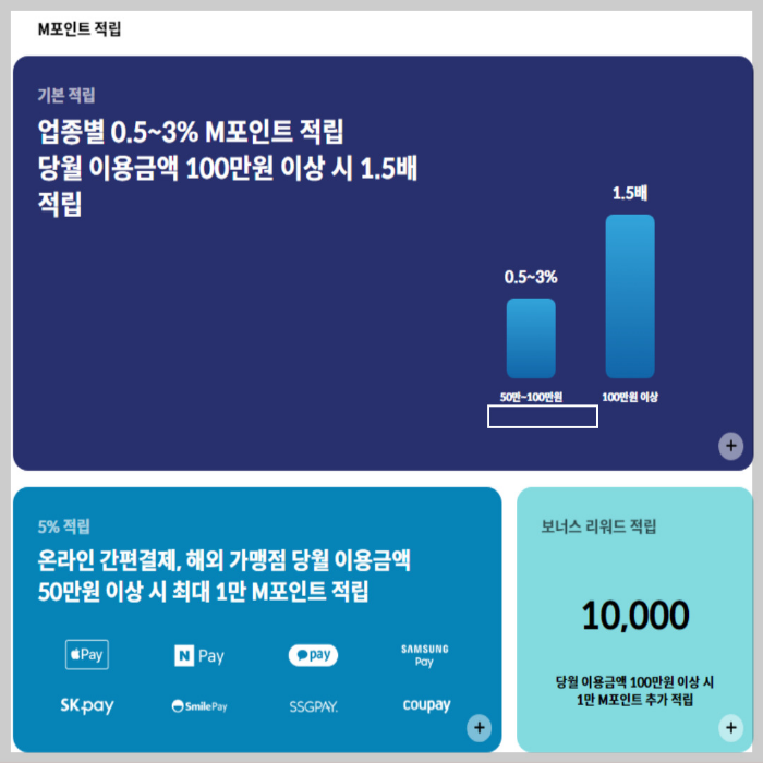 위의 혜택을 보시면 알겠지만 100만 원이 넘어가는 경우에 1만 포인트를 주는 것도 있고 포인트 적립도 극대화가 되다 보니 소비가 많으신 분들에게 좋은 혜택이라고 생각됩니다.