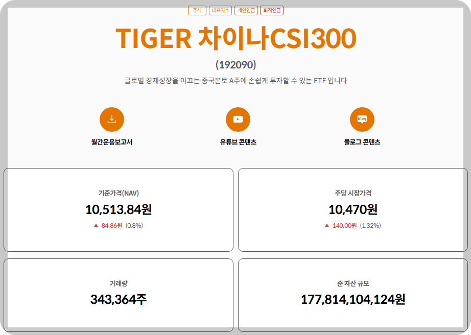 연금 ETF 추천 마지막은 중국 대표 지수인 CSI 300을 추종하는 TIGER 차이나 CSI300입니다.