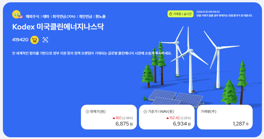 연금 ETF 추천 여섯 번째는 KODEX 미국클린에너지나스닥입니다. 글로벌 친환경 에너지 기업에 투자하는 ETF입니다.