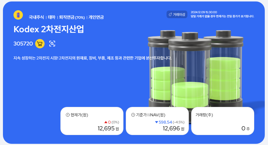 연금 ETF 추천 다섯 번째는 KODEX 2차 전지산업입니다. 전기차와 배터리 관련 산업에 집중 투자하는 ETF입니다.