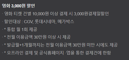 영화 3천 원 할인입니다. 영화 티켓 10,000원 이상 결제 시 3,000원 할인 혜택입니다.