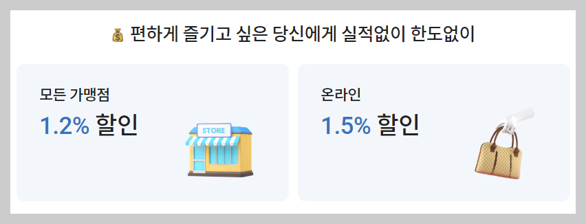 주요 혜택은 간단합니다. 가맹점 1% 할인 온라인 간편 결제 시 1.7% 할인입니다.