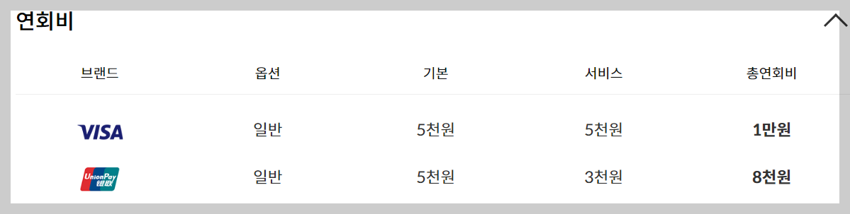연회비는 비자의 경우 1만 원, 유니온 페이의 경우 8천 원입니다.