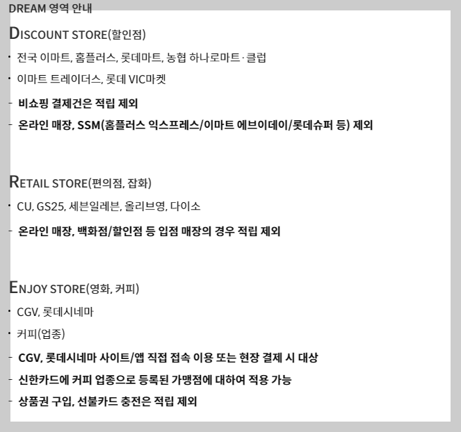 위의 적립율을 제외하고 신한 Deep dream카드는 영역별로 적립율이 상당히 차이가 납니다.