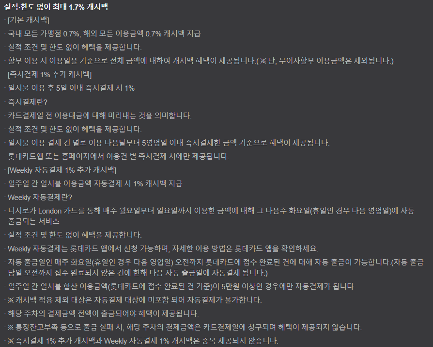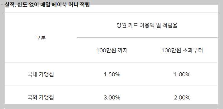 적립율도 상당히 높은 편입니다. 일반적으로 국내 가맹점을 많이 이용하는 경우가 많으니 국내 가맹점 기준으로 보면 1.5%입니다. 물론 100만 원까지만 1.5%이고 그 이후는 1%입니다. 전월실적이 없는 카드치고 진짜 꽤 괜찮네요.