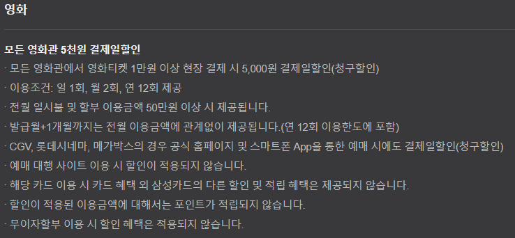 모든 영화관 및 주유소가 할인이 됩니다. 달에 영화는 5천 원, 그리고 주유소는 5만 원 이상 결제 시 2천 원 할인입니다.