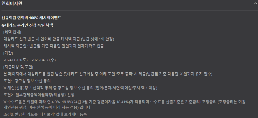-> 기간은 2024.06.01~2025.04.30까지로 조건은 광고성 정보 수신 동의, 리볼빙 신청, 카드를 디지로카 앱에 등록하는 것입니다. 잘 확인하셔서 연회비 돌려받으면 좋습니다!