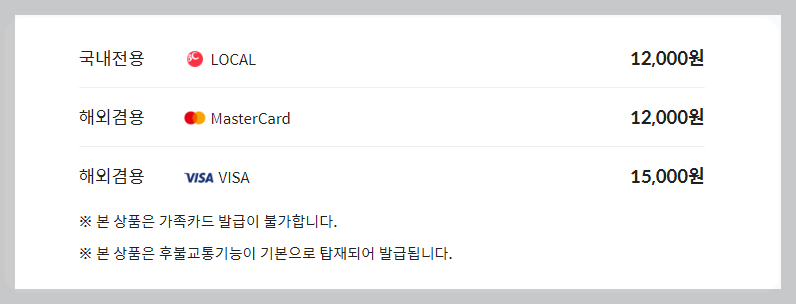 국내전용이랑 해외겸용 둘 다 12,000원입니다. 하지만 해외겸용 중에서 비자카드의 경우 15,000원입니다.