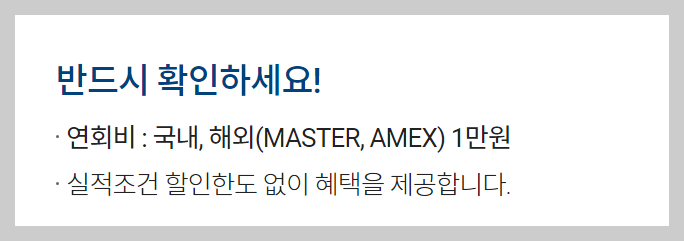 연회비는 국내외 카드사 브랜드 별로 상관없이 20,000원입니다. 연회비는 조금 비싼 편입니다. 그런데 최근에 연회비 이벤트가 있더라고요.