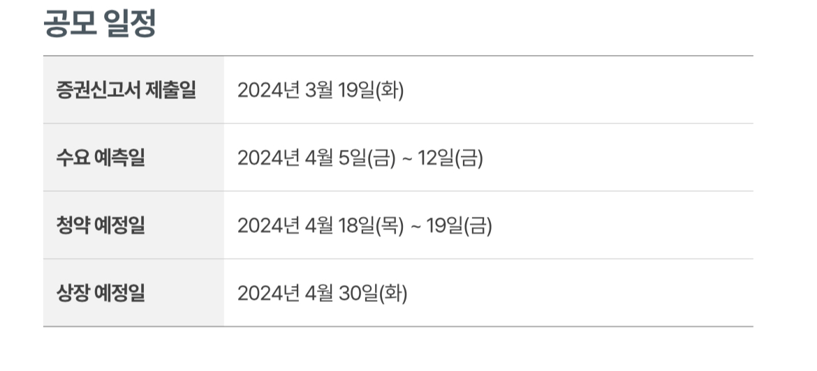 2024년 청약 일정은 4월 18-19일이고 상장예정일은 4월 30일입니다.