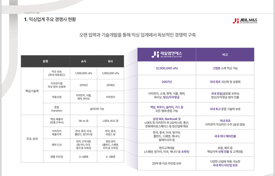 제일엠앤에스와 주요 경쟁사와의 비교 부분입니다.