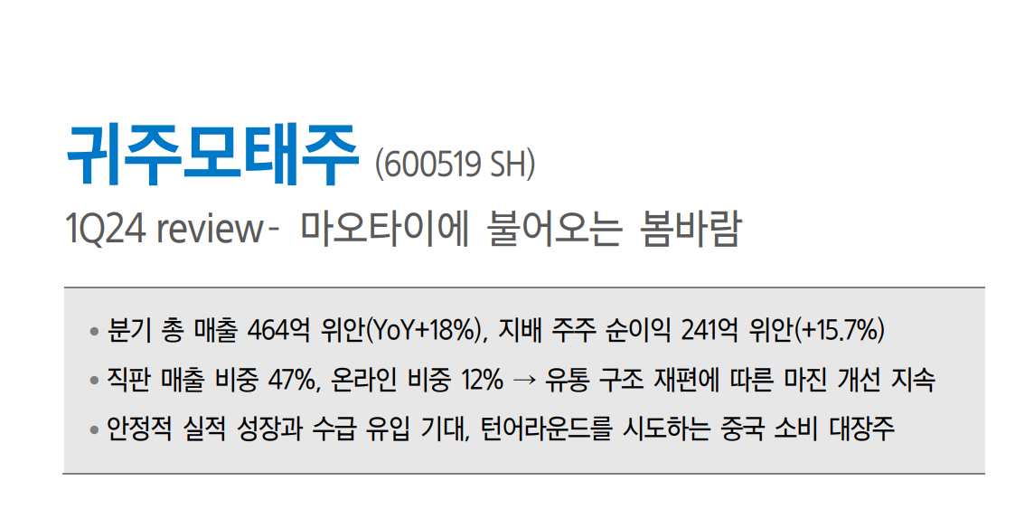 귀주모태주는 중국의 대표적인 고급 백주(白酒) 제조업체로, ‘마오타이주’라는 브랜드로 세계적으로 유명합니다. 오랜 전통과 독특한 제조 공법으로 생산되는 마오타이주는 중국 내뿐만 아니라 국제적으로도 높은 평가를 받고 있습니다.