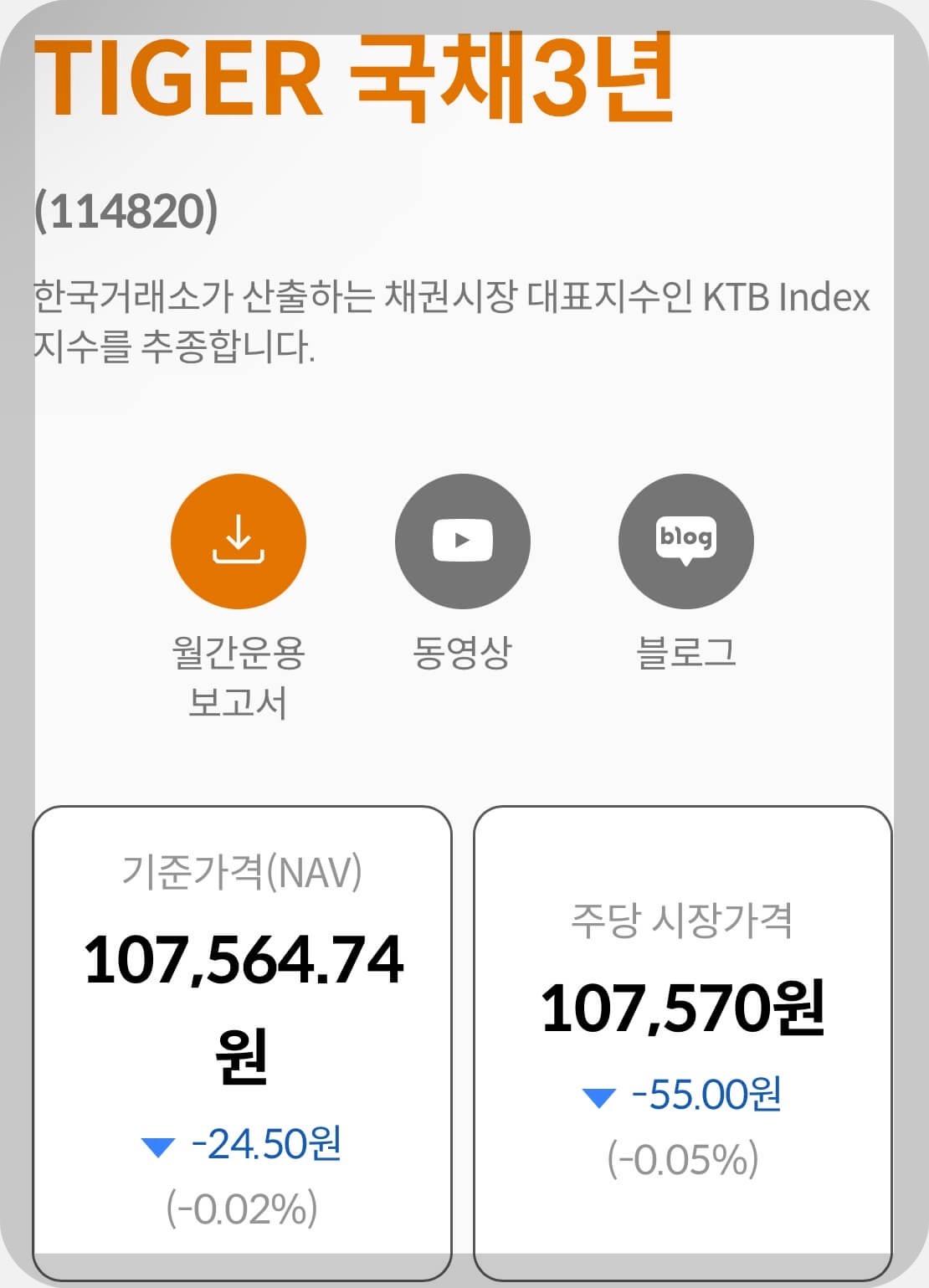 채권 ETF 추천 두 번째는 TIGER국고채 3년 ETF입니다.