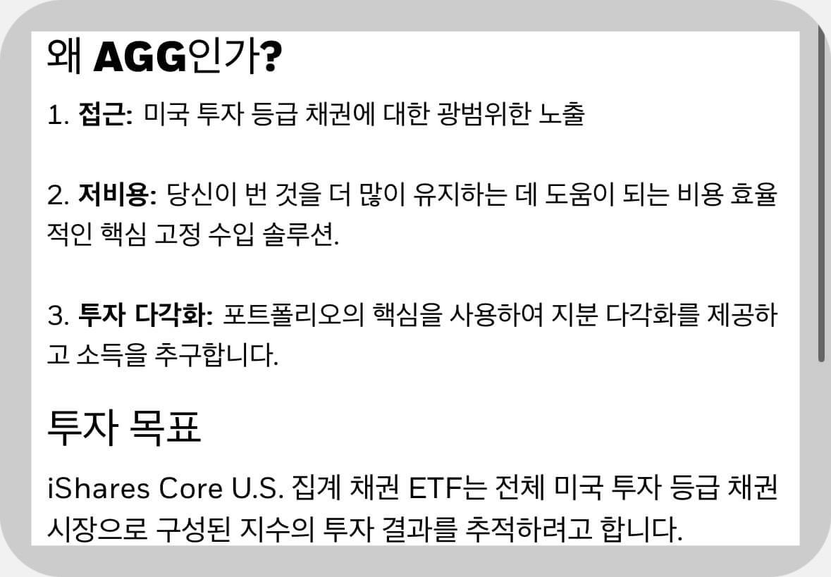 특징: 미국 전체 채권 시장을 추종하며 안정성과 수익률의 균형을 맞춘 상품입니다.