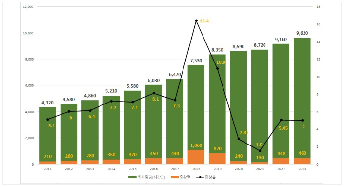위의 그래프는 2011년부터 2023년까지 최저임금 추이표입니다. 눈에 띄는 부분은 2018년 임금상승이 상당히 눈에 띕니다. 무려 16.4%가 상승한 것이 보이시죠. 엄청납니다. 한번 확인들 하시고 연도별로 어떻게 변했는지 확인해 보시면 좋을 것 같습니다.