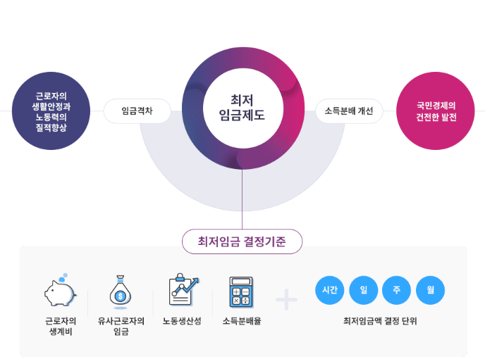 최저임금은 고용자가 피고용인을 저임금으로 부리는 착취를 막기 위해 정부에서 정한, 피고용인에게 지급해야 할 최소한의 임금을 말하는데요. 법으로 최소한의 의식주 생활이 가능한 급여기준을 정하여 근로자의 생존권을 보호하는 제도적 장치입니다. 근로자의 생활안정과 노동력의 질적 향상을 위하여 각 나라는 자국의 법과 규정에 의해 최저 임금을 정하고 있습니다.