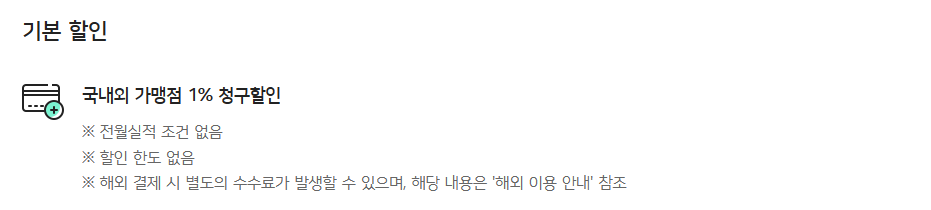 왜냐하면 이 카드의 큰 장점은 이용실적이 없고 원 할인 한도가 없다는 것이기에 상황에 맞게 사용하시면 될 것 같습니다.