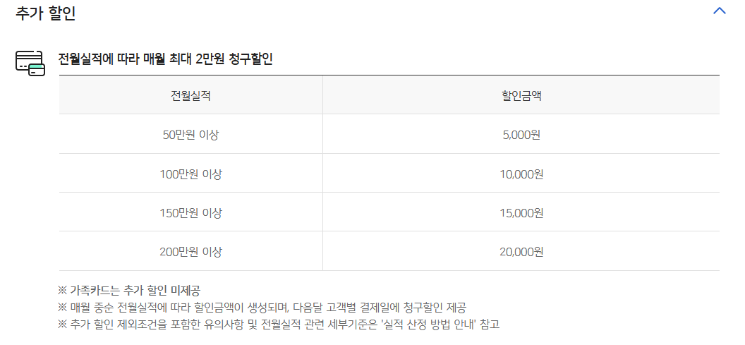 카드의 정석 EVERY 1 카드는 실적을 달성하지 않아도 기본 할인 혜택은 있지만, 위의 추가할인 혜택의 경우는 실적을 많이 사용하는 경우 50만 원 이상의 경우 5,000원, 100만 원은 10,000원 이런 식으로 추가 할인이 들어갑니다.