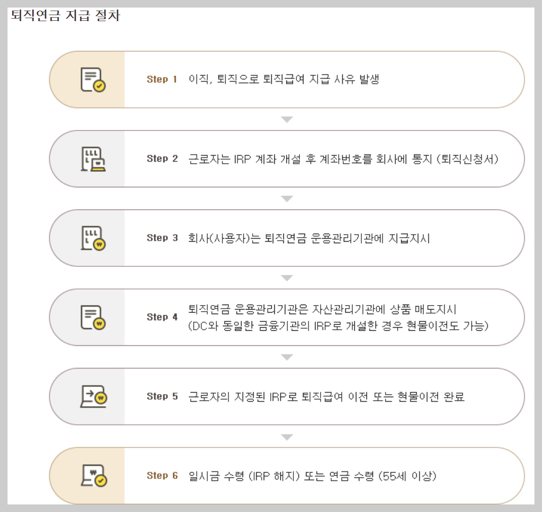 - 일시금 수령: 퇴직연금 관리 금융기관에 방문 및 신청(신청 후 영업일 3~5일 이내로 계좌(개인 IRP)로 지급)