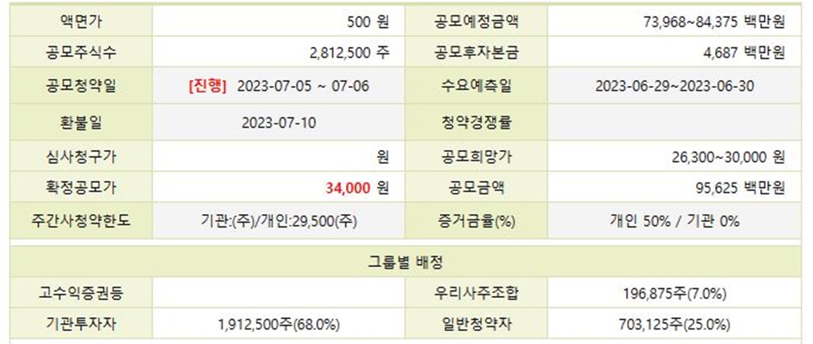 2023년 6월 29일 ~ 2023년 6월 30일 수요예측을 했고 수요예측 결과 확정공모가는 34,000원이고 기관의 수요예측 경쟁률은 1,811.55:1입니다.