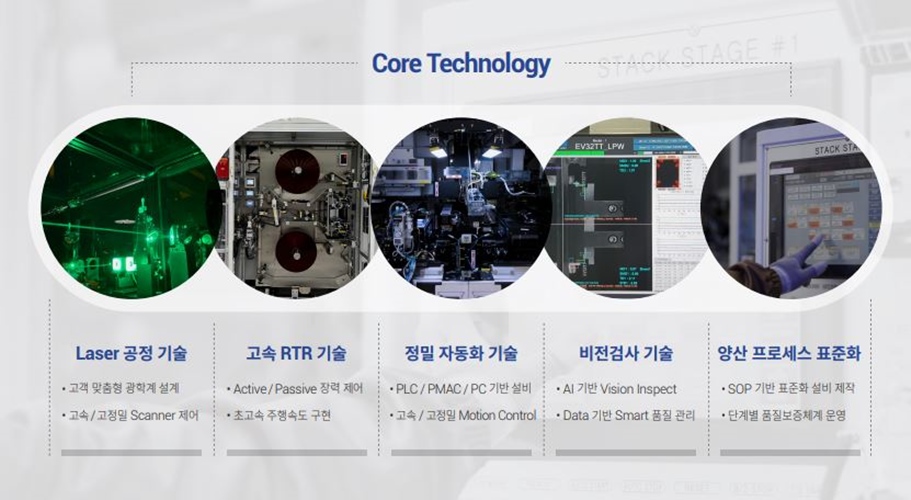 필에너지는 업계의 최고 수준의 기술력을 가지고 있는데요. LASER 공정기술, 고속 RTR 기술, 정밀 자동화 기술, 비전검사기술, 양산 프로세스 표준화의 주요 기술이 있습니다.