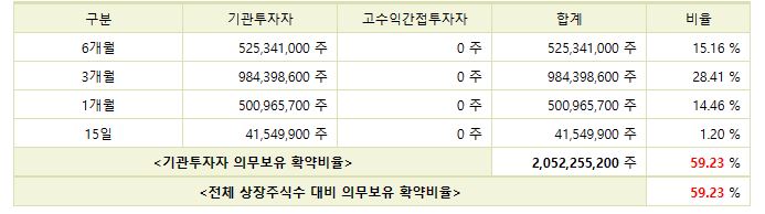 의무보유확약비율은 59.2%로 상당히 높습니다. 3개월 이상 확약도 43.57%로 높은 수준입니다.