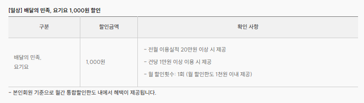 배달의 민족, 요기요 할인입니다. 전원실적이 20만 원 이상 시 제공이 됩니다.